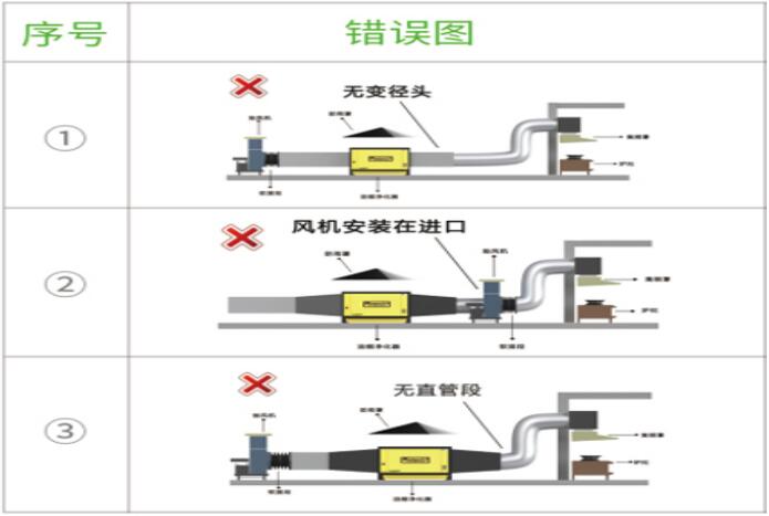 2、風機安裝在進口——改良方法:要求風機安裝在凈化器后,讓風機處于抽風狀態,切勿讓風機安裝在凈化器前面。